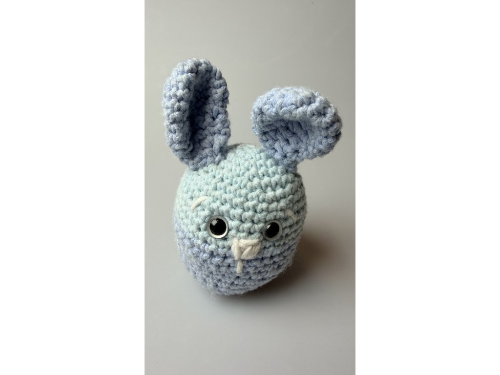 ...blankytně modrý králíček "ušák", který má krásná černá kukadla a bílý nosík. Králíček je 11 cm vysoký a 6 cm široký.